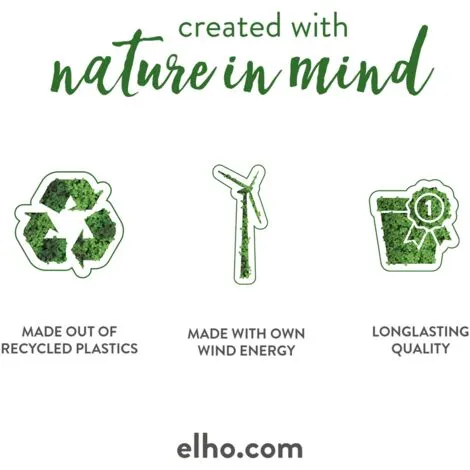 Vous souhaitez ajouter de la verdure à votre balcon ou à votre jardin ? Les pots de plantes, les jardinières et les accessoires d’Elho y veillent. Elho a un pot de fleurs ou un bac à plantes approprié pour chaque endroit dans et autour de votre maison. Laissez-vous inspirer par la vaste collection et faites de votre maison une maison verte. Et vous pouvez être sûr que ce pot ou cette jardinière est fabriqué avec amour pour la nature. Il est fabriqué à partir de plastique 100% recyclé, produit grâce à l’énergie éolienne provenant du propre moulin d’Elho, et est également entièrement recyclable.